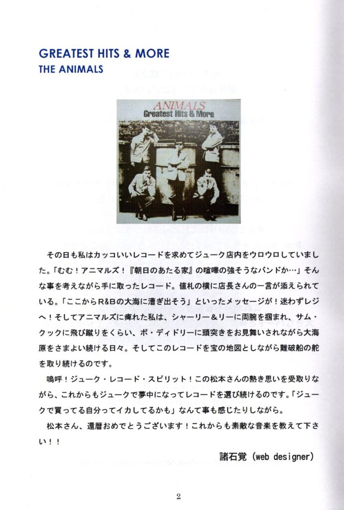 2010年2月、松本さんが還暦を迎えられた際に、冊子を常連客有志の発案で作ったことがあった。それは多くの常連客が、想い出深いレコードを一枚ずつ紹介していくという内容で、還暦パーティーの際、松本さんに、サプライズで差し上げたのである。その時、松本さんは照れた笑顔で「私は世界一幸せなレコード屋です」と仰っていたことが忘れられない。